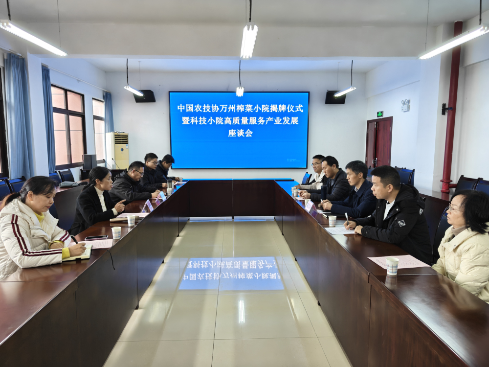 揭牌仪式上,牟万平、司军与戚文华共同为榨菜科技小院揭牌,标志着榨菜科技小院正式落户我院。随后的座谈会中,与会人员就榨菜科技小院运行机制、核心研究方向等开展了交流研讨。